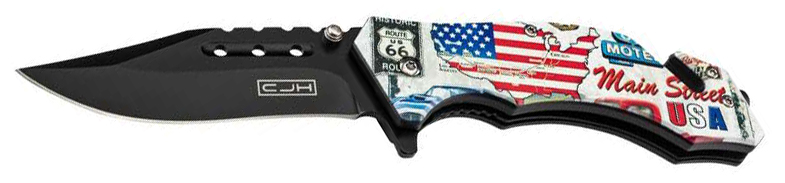 Son manche en ABS de 12 cm présente une impression 3D détaillée de la carte Route 66 sur une face, et un coloris noir sur l’autre. Idéal pour les collectionneurs, passionnés de USA et amateurs d’EDC originaux. Il est également doté d’un clip de ceinture, d’un pic brise-vitre en bout ainsi que d’un coupe-ceinture de sécurité intégré, ce qui en fait un couteau polyvalent pour l’outdoor, l’auto et la sécurité.