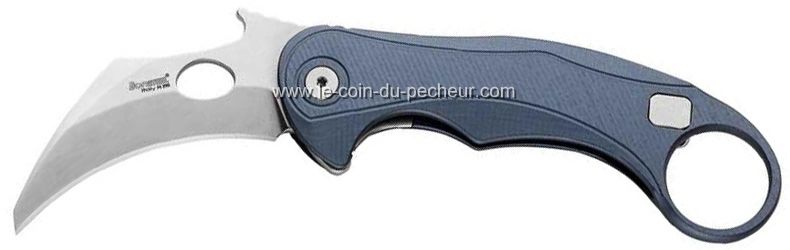 - Une lame Hawkbill à trou en acier M390 Bohler finition « stonewashed » avec « flipper »,