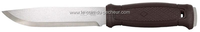La lame du Mora Garberg Grand de 14,2 cm en acier inoxydable suédois 14C28N pleine soie (full tang) et épaisse de 3,2 mm, offre une grande solidité pour les travaux intensifs : couper du bois, tailler, fendre des branches ou construire un abri. L’émouture scandinave assure une coupe précise et un affûtage facile sur le terrain. Son grand manche ergonomique en polymère marron avec grip antidérapant garantit une prise en main sûre par tous les temps. Le couteau est livré avec un étui en cuir pour port à la ceinture et est fabriqué en Suède.
